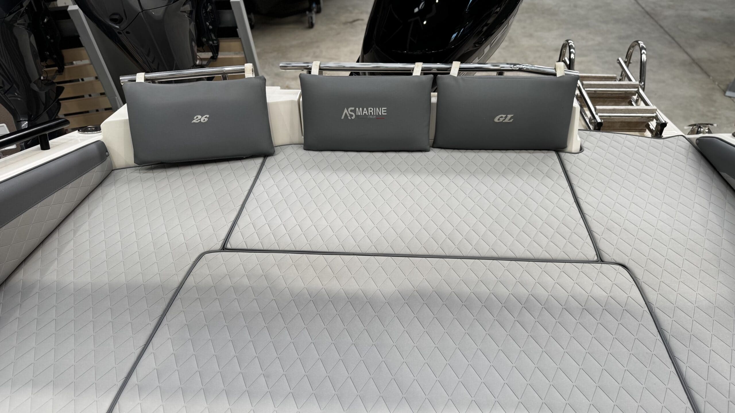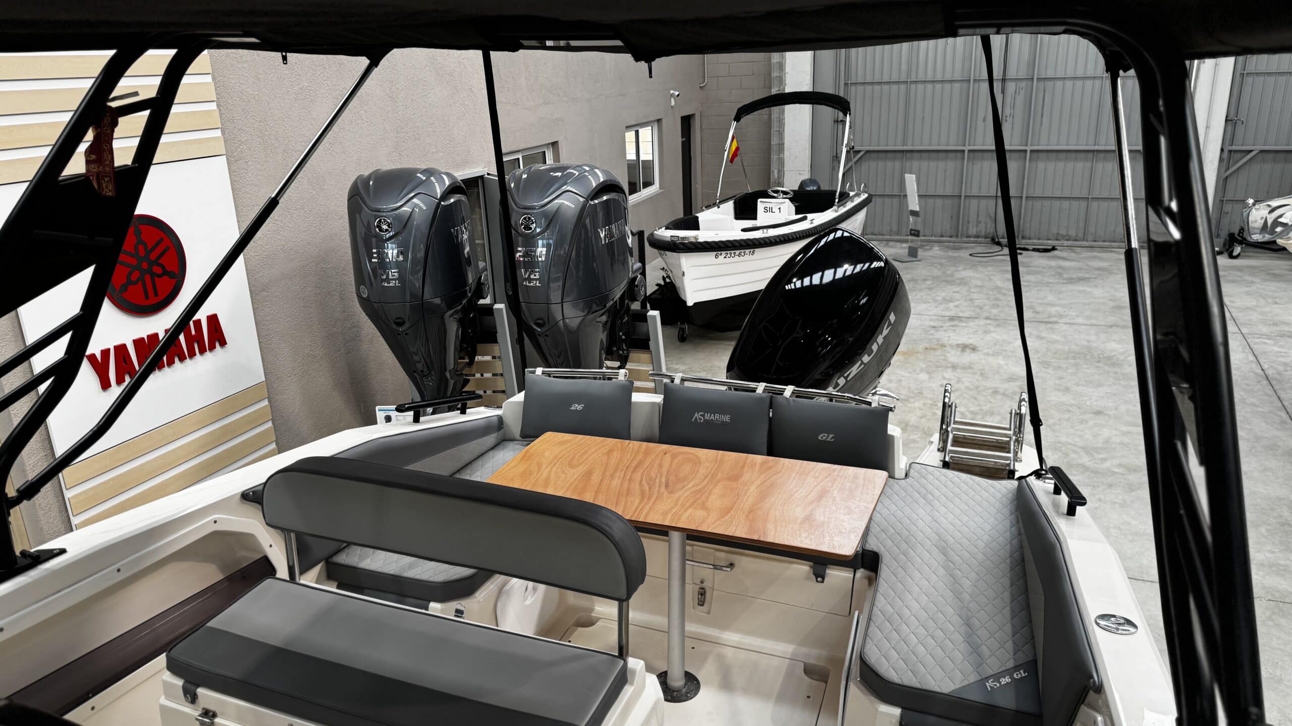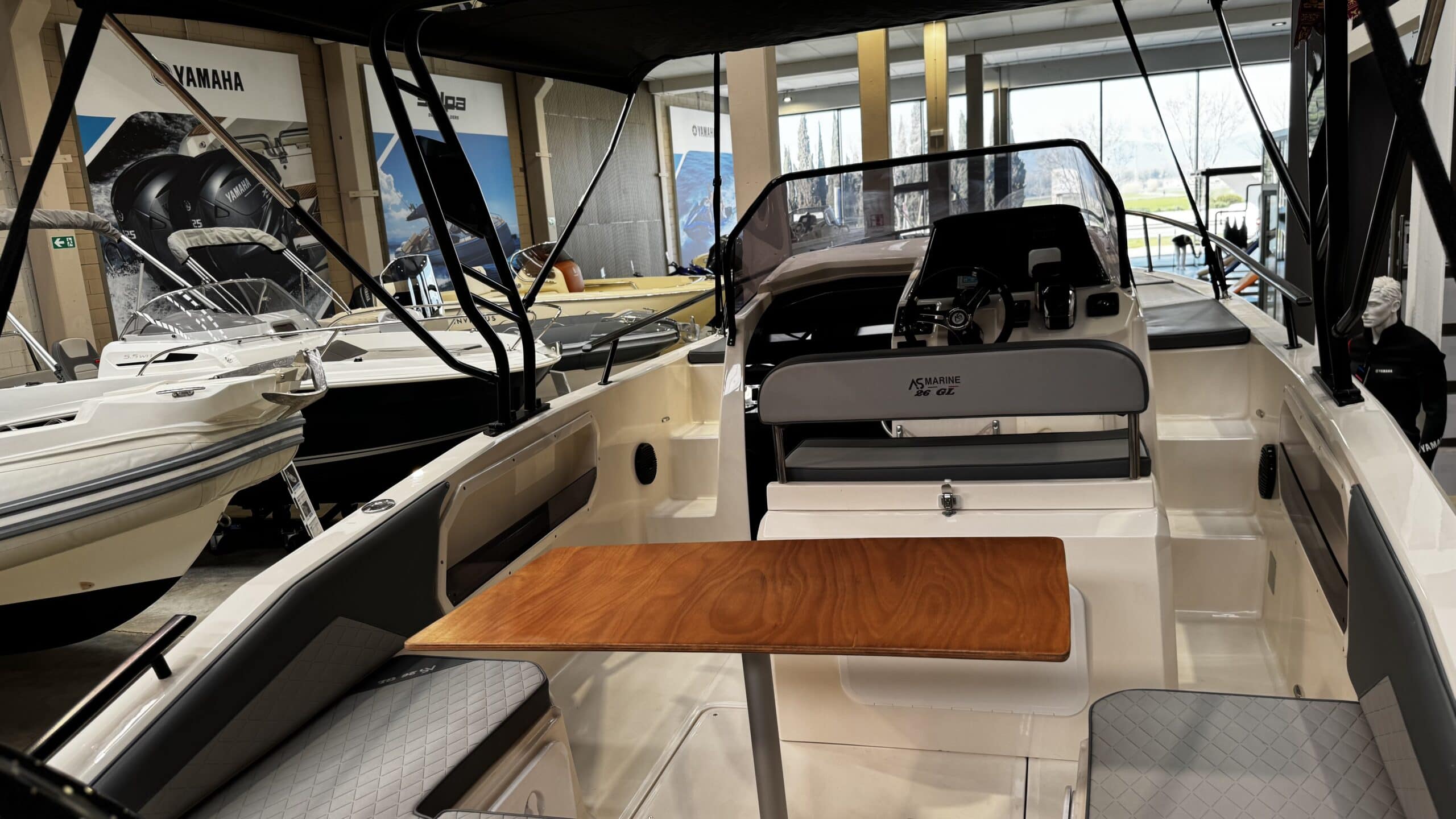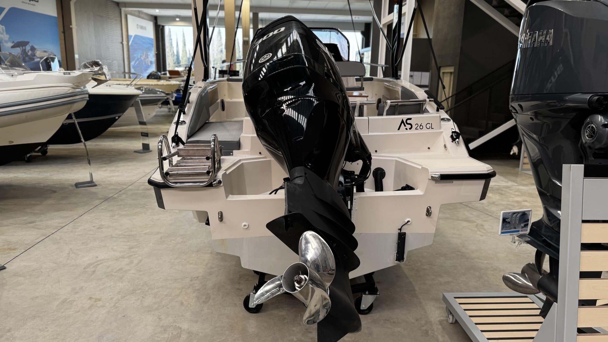 AS MARINE 26 GL. Una embarcació elegant i esportiva, dissenyada per a una navegació còmoda i segura. La seva generosa eslora i mànega permeten una excel·lent distribució de l’espai tant a proa com a popa. Compta amb un gran solàrium a proa, una zona d’estar amb taula central i una consola de timó completa i ergonòmica, ideal per gaudir de llargues jornades de navegació amb total comoditat.