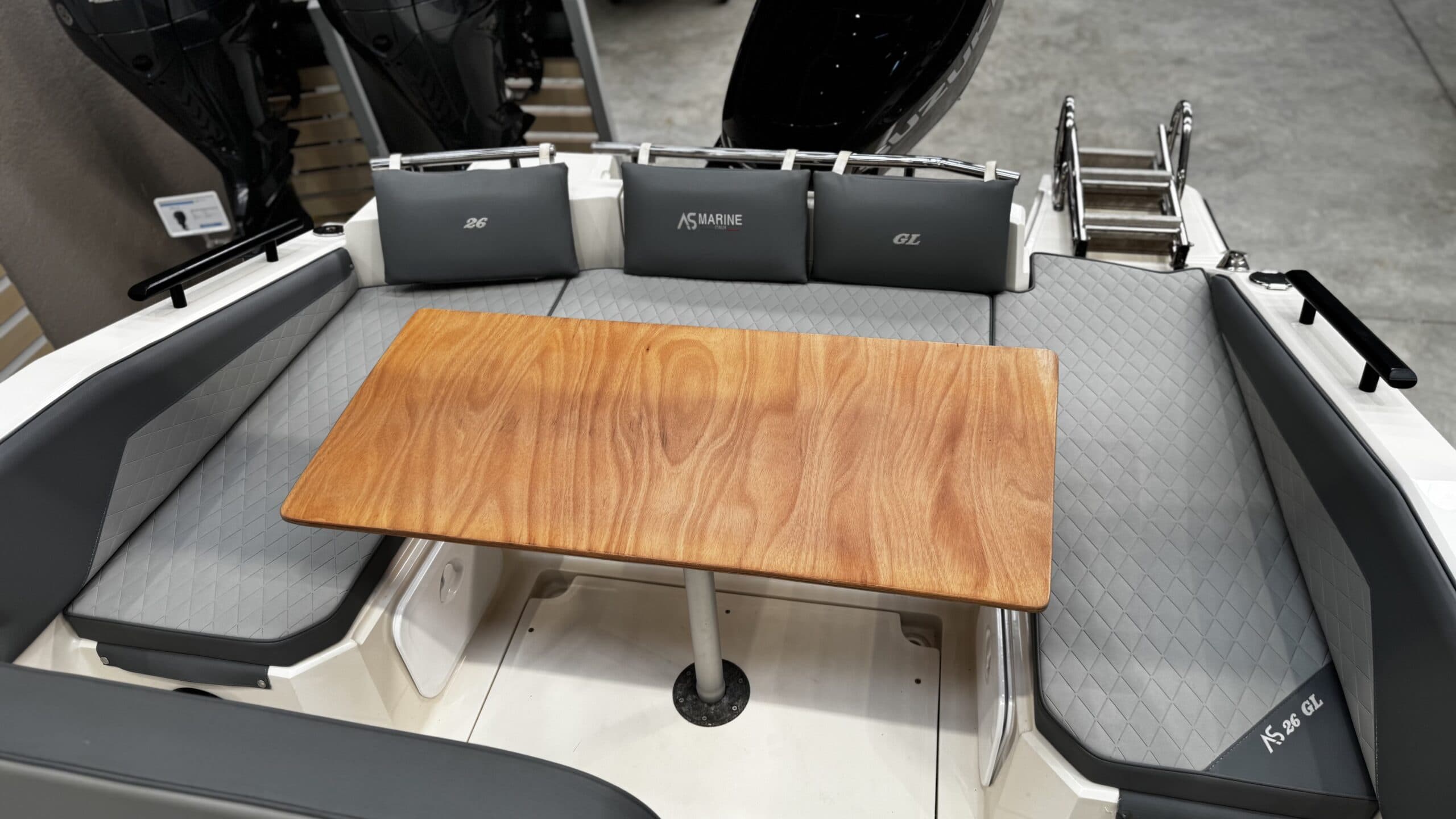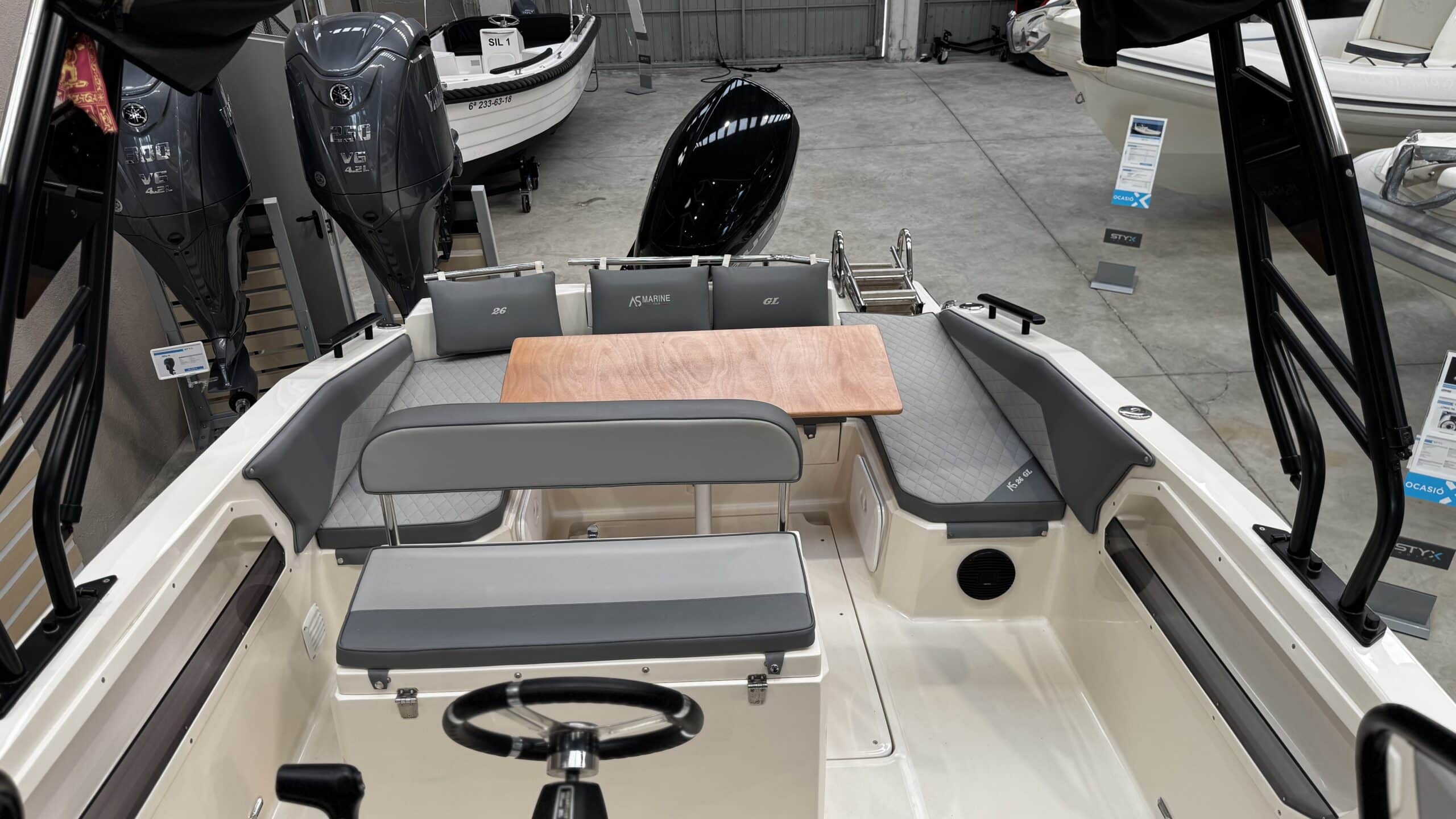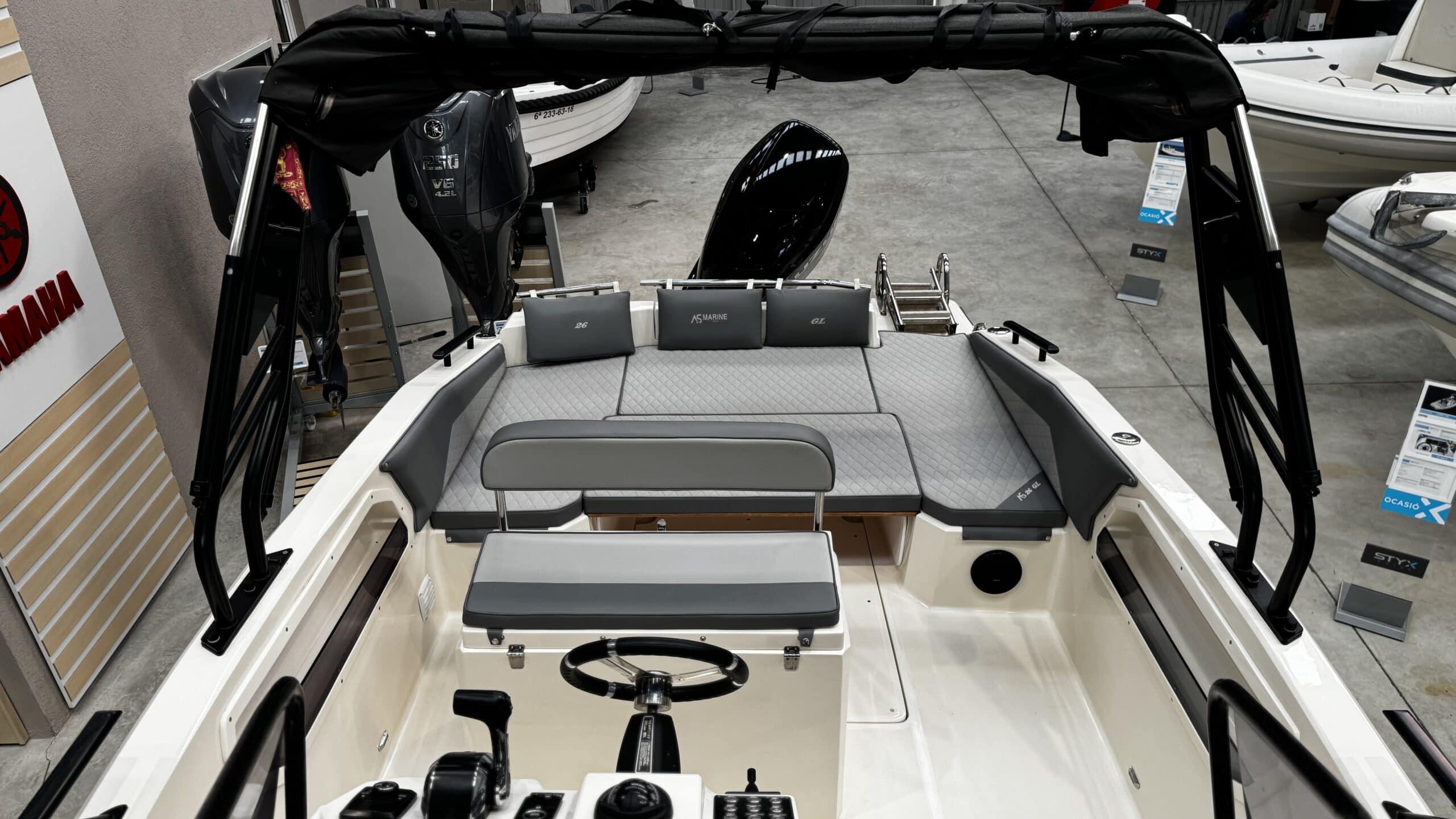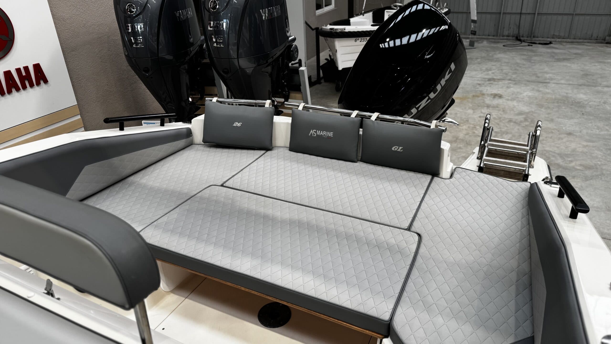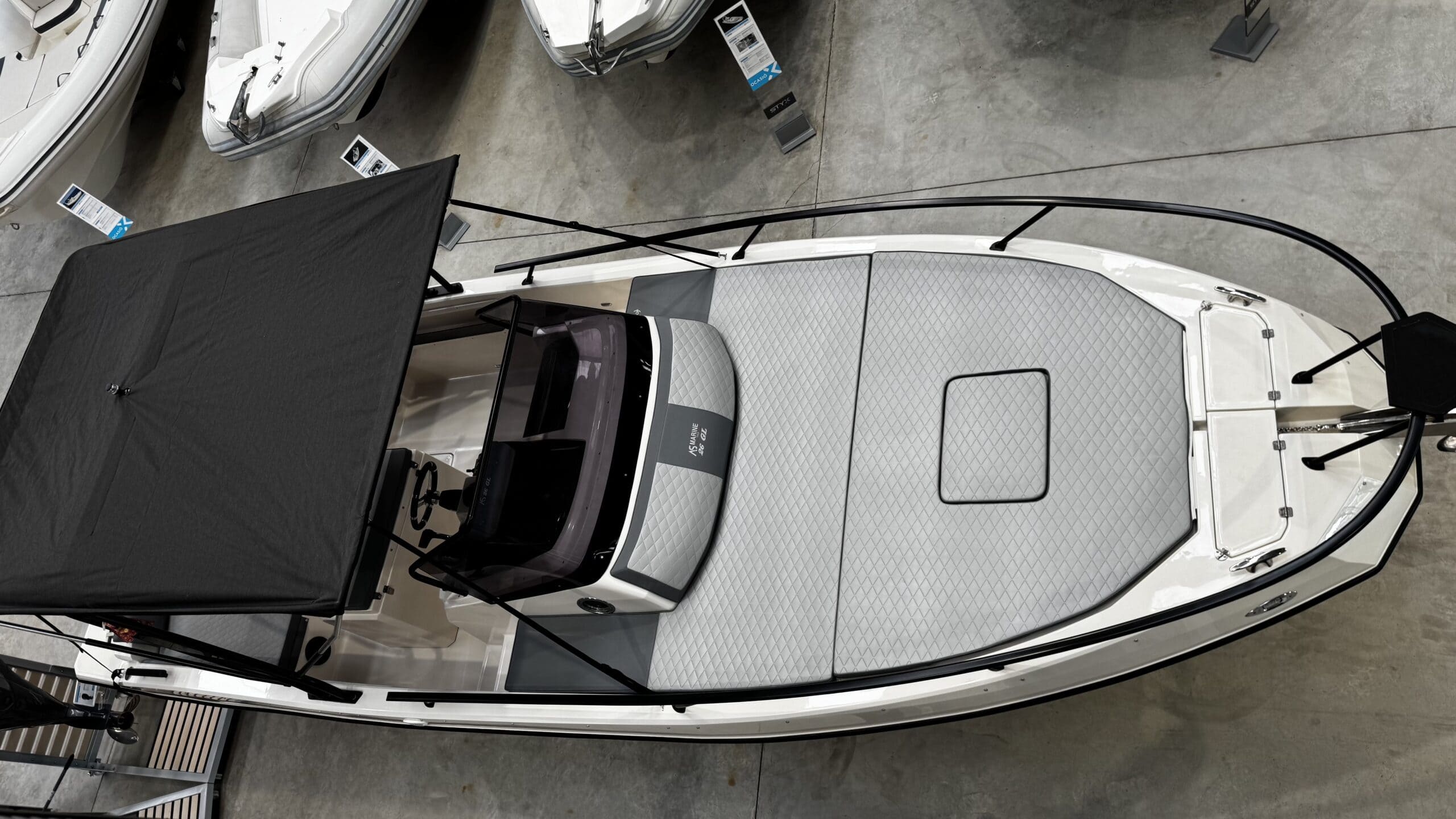 AS MARINE 26 GL. Una embarcació elegant i esportiva, dissenyada per a una navegació còmoda i segura. La seva generosa eslora i mànega permeten una excel·lent distribució de l’espai tant a proa com a popa. Compta amb un gran solàrium a proa, una zona d’estar amb taula central i una consola de timó completa i ergonòmica, ideal per gaudir de llargues jornades de navegació amb total comoditat.